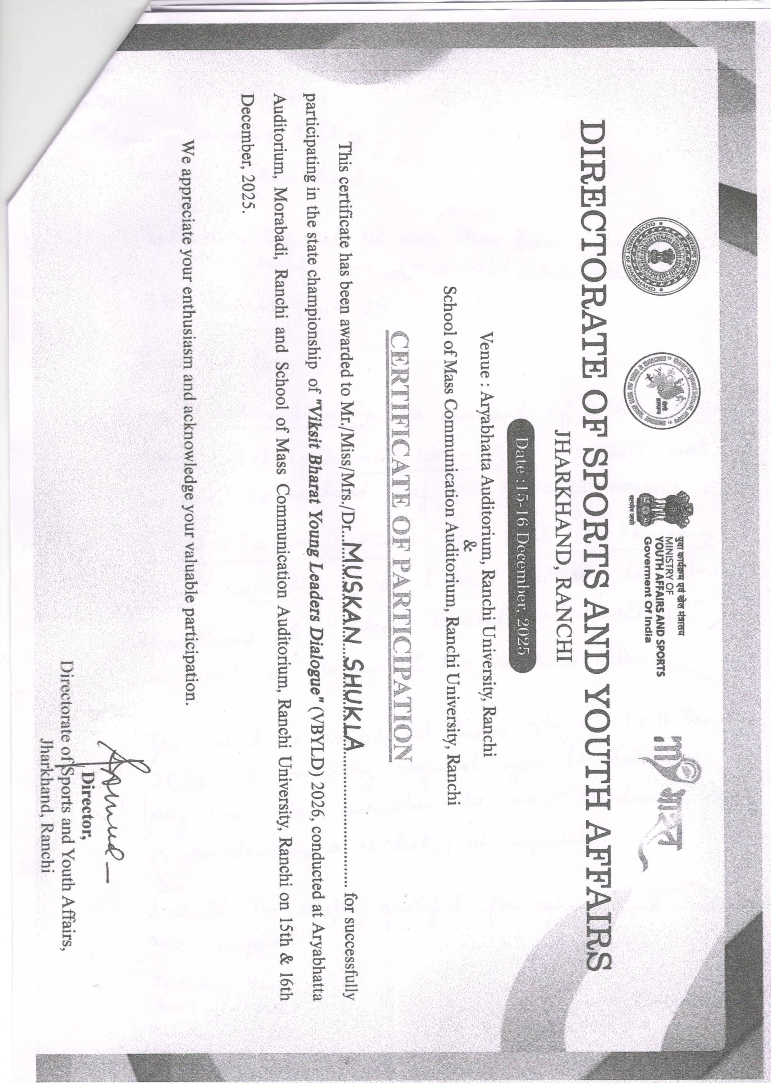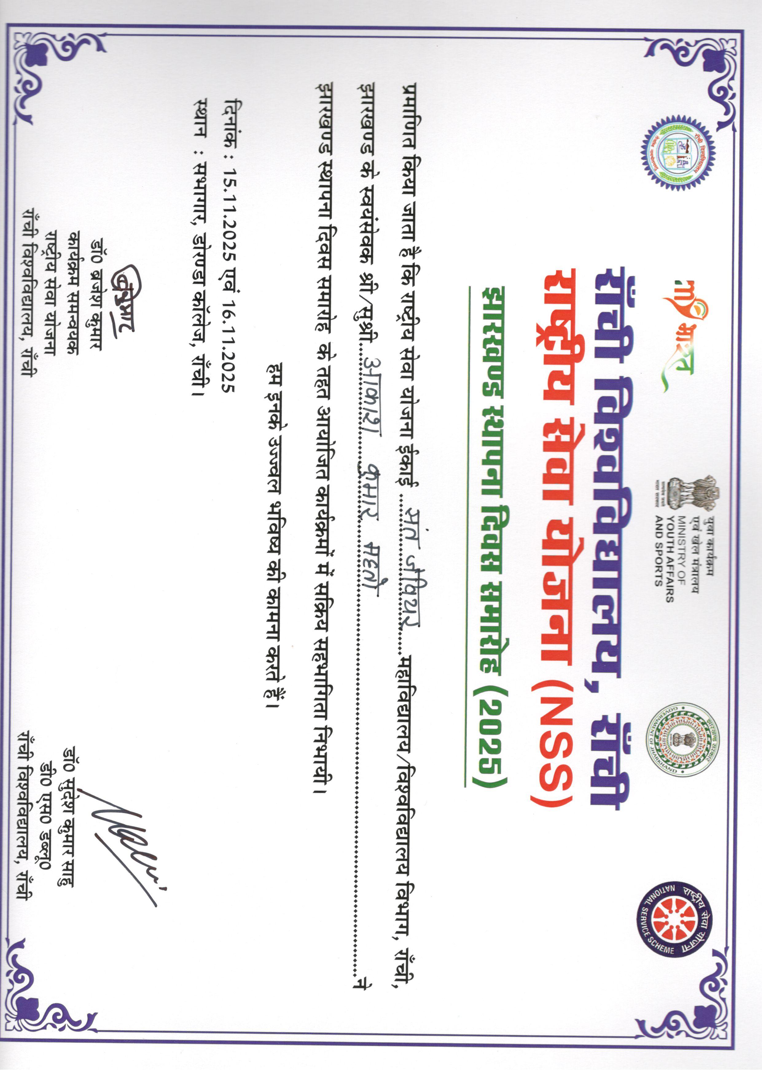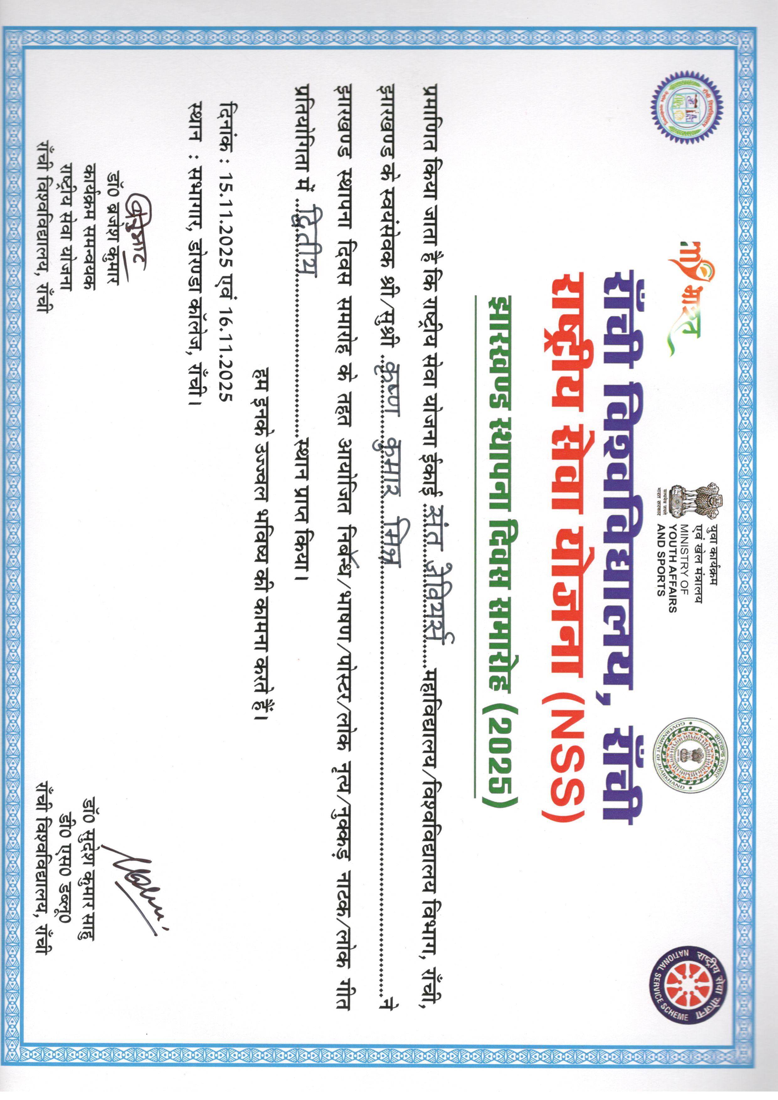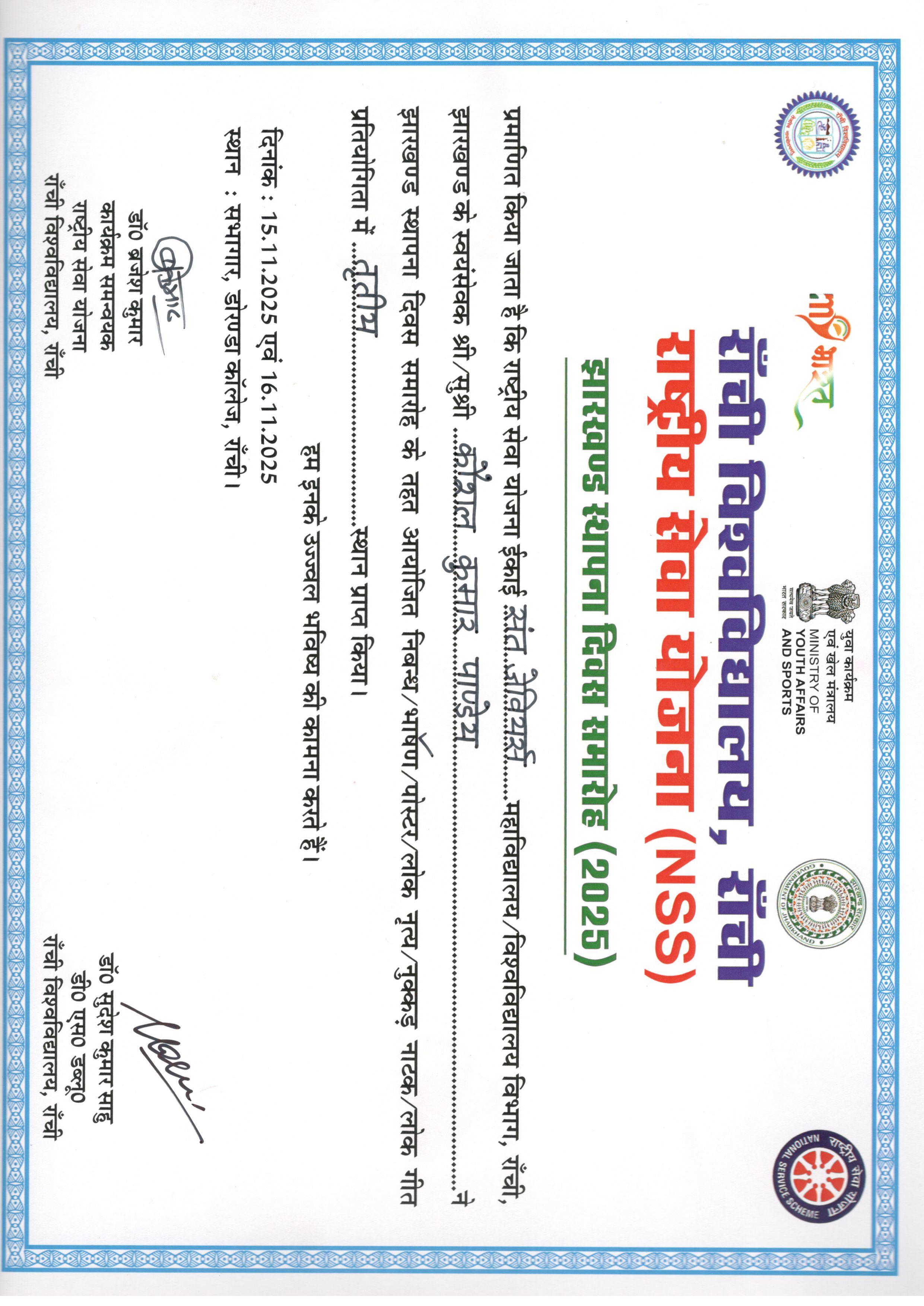 Awarded 3rd position in Essay Writing organized Ranchi University on the ocassion of Jharkhand Day Celebration 2025 |