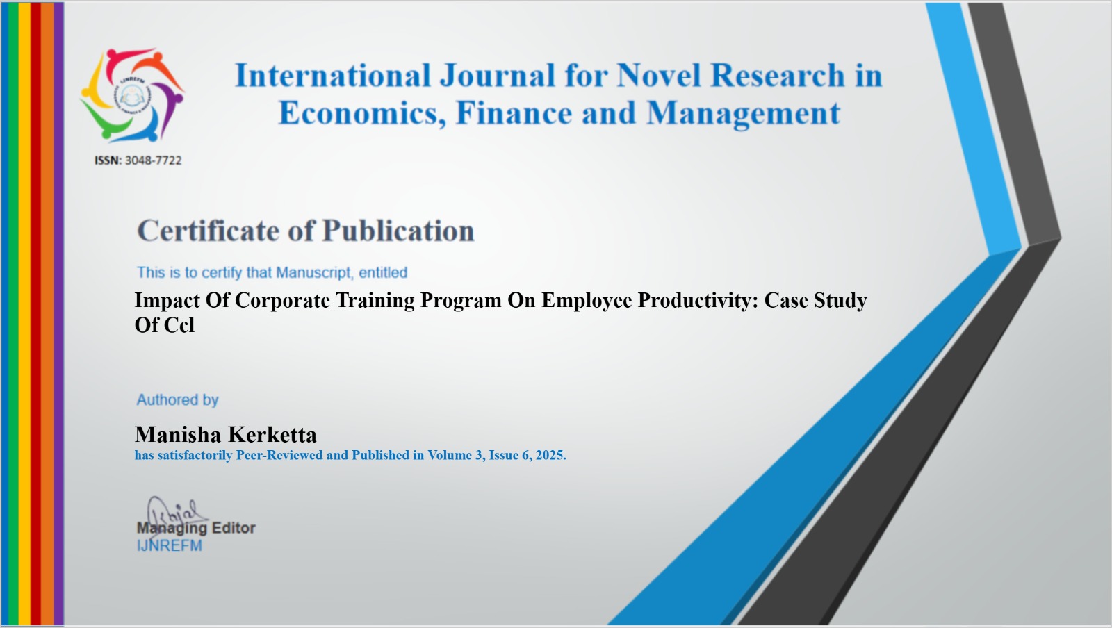 Pubished Research Papers: Impact of Corporate Training Programs on Employee Productivity (A Case Study of Central Coalfields Limited (CCL)) |