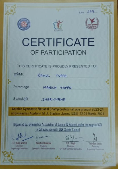 Participated in the Aerobic Gymnastic National Championships (all age groups) at Gymnastics Academy, M.A. Stadium, Jammu (J&K), 22-24 March, 2024 |