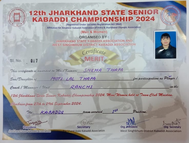 Participated in the 12th State Level Senior Kabaddi Championship 2024 and her team secured 1st Position. |